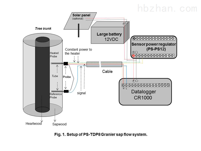 上图显示该系统在树上的安装及全套系统组成和配置。一套完整的Granier系统包括探针、热均铜管、金属屏蔽专用信号电缆、探头恒流电源系统(PS-PS12)、数采仪及蓄电池或太阳能板。
